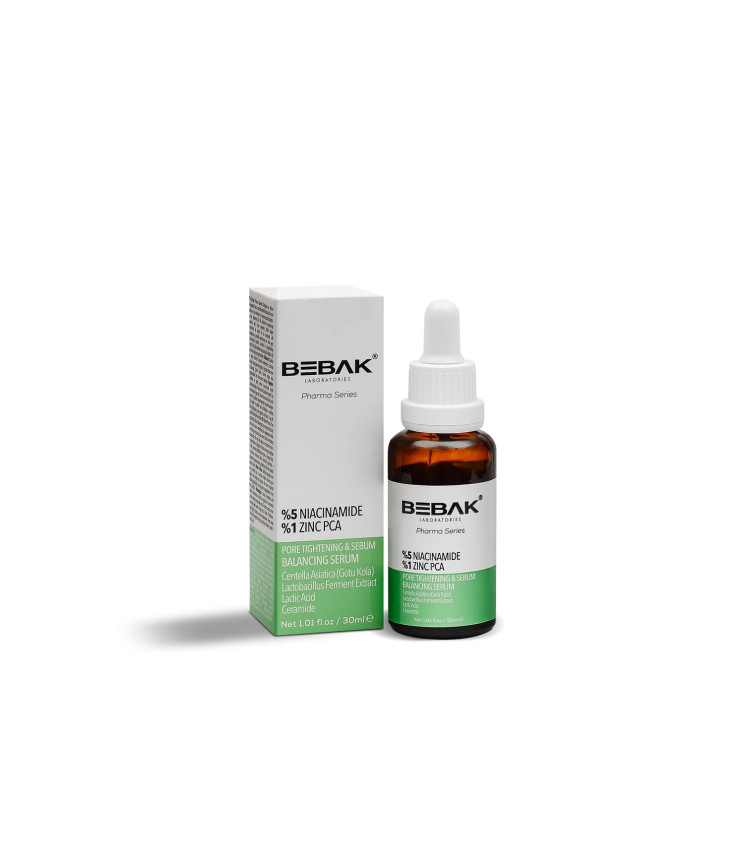 Передова сироватка BEBAK має здатність розгладжувати поверхню шкіри та відчутно оновлювати її, мінімізуючи втрату вологи за допомогою ніацинаміду в складі. Засіб підтягує шкіру, звужує пори, регулює виділення шкірного сала. Формула містить цинк, який відіграє важливу роль у виробленні власного колагену, і робить шкіру підтягнутою й пружною, помітно омолоджує. Цераміди у складі сироватки забезпечують сяючий вигляд шкіри, захищаючи її від негативного впливу зовнішніх факторів. Активні інгредієнти: 5% ніацинаміду, 1% цинку PCA, Готу Кола, ферментний лізат лактобактерій, молочна кислота, цераміди.