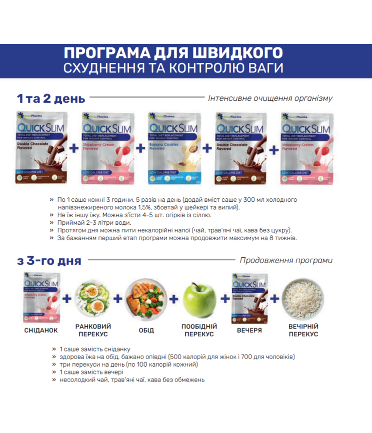 | Застереження | Не є лікарським препаратом. Для контролю маси тіла добавка замінює загальний добовий раціон, оскільки забезпечує достатню добову кількість усіх основних поживних речовин за умови дотримання рекомендацій щодо вживання. Продукт призначений лише для здорових дорослих із надлишковою вагою або ожирінням, які мають намір знизити масу тіла. Без попередньої консультації з лікарем тим здоровим дорослим із надмірною вагою або ожирінням, хто дотримується інтенсивної програми, не слід вживати продукт довше 8 тижнів. Важливо щодня пити достатню кількість рідини. Вагітним і годуючим жінкам, підліткам, а також людям, які приймають ліки чи проходять медикаментозне лікування, слід проконсультуватися з лікарем перед вживанням продукту. Не використовувати після закінчення терміну придатності. |